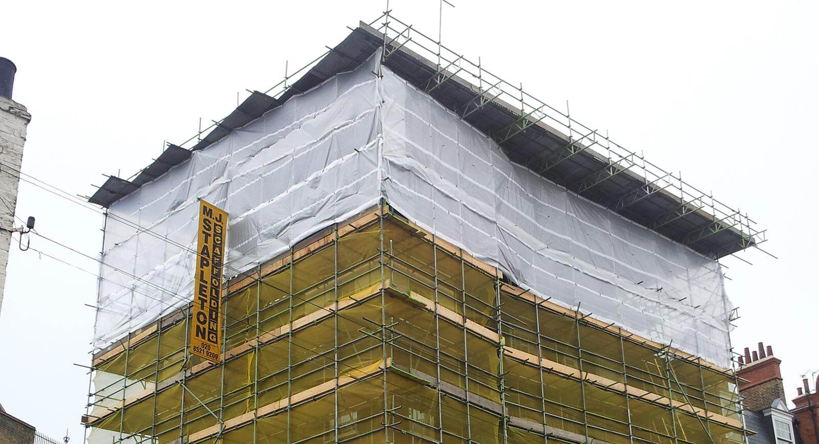 Independent scaffold, with temporary roof structure and access to numerous chimney stacks to suit remedial works to the roof and facade.